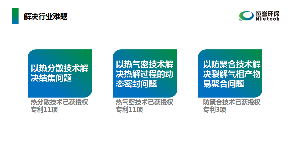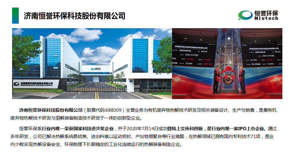 “作為行業(yè)內(nèi)榮獲國家科技進(jìn)步獎(jiǎng)企業(yè),IPO上市企業(yè),恒譽(yù)環(huán)保通過多年研發(fā),已解決熱解系統(tǒng)易結(jié)焦、進(jìn)出料難以運(yùn)動(dòng)密封、產(chǎn)出物易聚合等行業(yè)難題,是業(yè)內(nèi)少數(shù)實(shí)現(xiàn)熱解設(shè)備安全、環(huán)保前提下長期穩(wěn)定的工業(yè)化連續(xù)運(yùn)行的熱解裝備制造企業(yè)。”