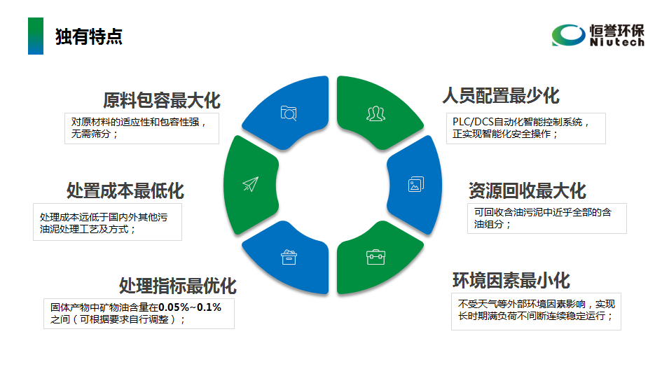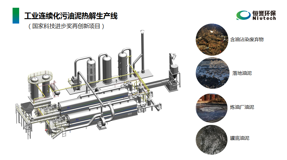 “恒譽(yù)環(huán)保自主研發(fā)的工業(yè)連續(xù)化含油污泥熱解生產(chǎn)線為國家科技進(jìn)步獎(jiǎng)再創(chuàng)新項(xiàng)目,具有原料包容最大化、處置成本最低化、資源回收最大化、處理指標(biāo)最優(yōu)化、環(huán)境因素最小化、人員配置最少化等獨(dú)有優(yōu)勢。”
