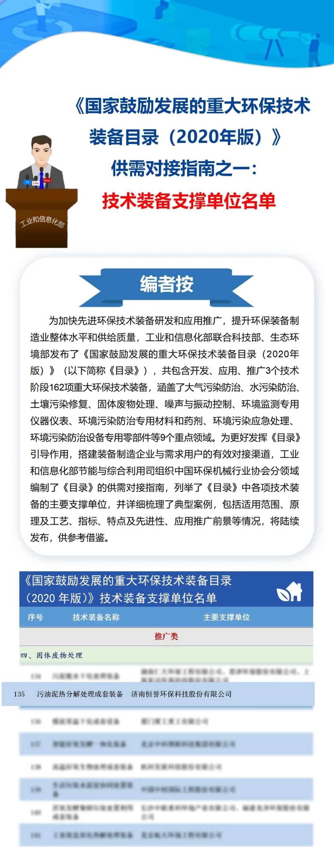 今日,工信部官網(wǎng)公示了《國家鼓勵發(fā)展的重大環(huán)保技術(shù)裝備目錄(2020 年版)》供需對接指南之一:技術(shù)裝備支撐單位名單,濟(jì)南恒譽(yù)環(huán)保科技股份有限公司成為國家鼓勵發(fā)展的重大環(huán)保技術(shù)裝備“污油泥熱分解處理成套裝備”技術(shù)裝備支撐單位。