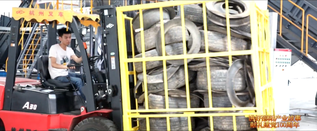 “一輛輛小車(chē)滿載著廢舊輪胎進(jìn)入廠區(qū),卸下的廢舊輪胎隨即被運(yùn)送到上料區(qū),經(jīng)過(guò)智能切割和清洗后再運(yùn)送到智能裂解裝備中”;