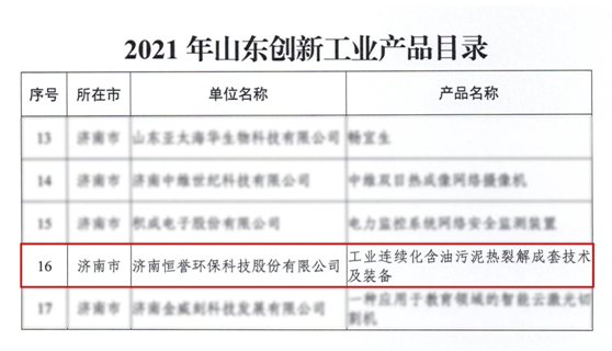 日前,山東省工業(yè)和信息化廳公布了《2021年山東創(chuàng)新工業(yè)產(chǎn)品目錄》,濟(jì)南恒譽(yù)環(huán)保科技股份有限公司“工業(yè)連續(xù)化含油污泥熱裂解成套技術(shù)及裝備”強(qiáng)勢上榜。